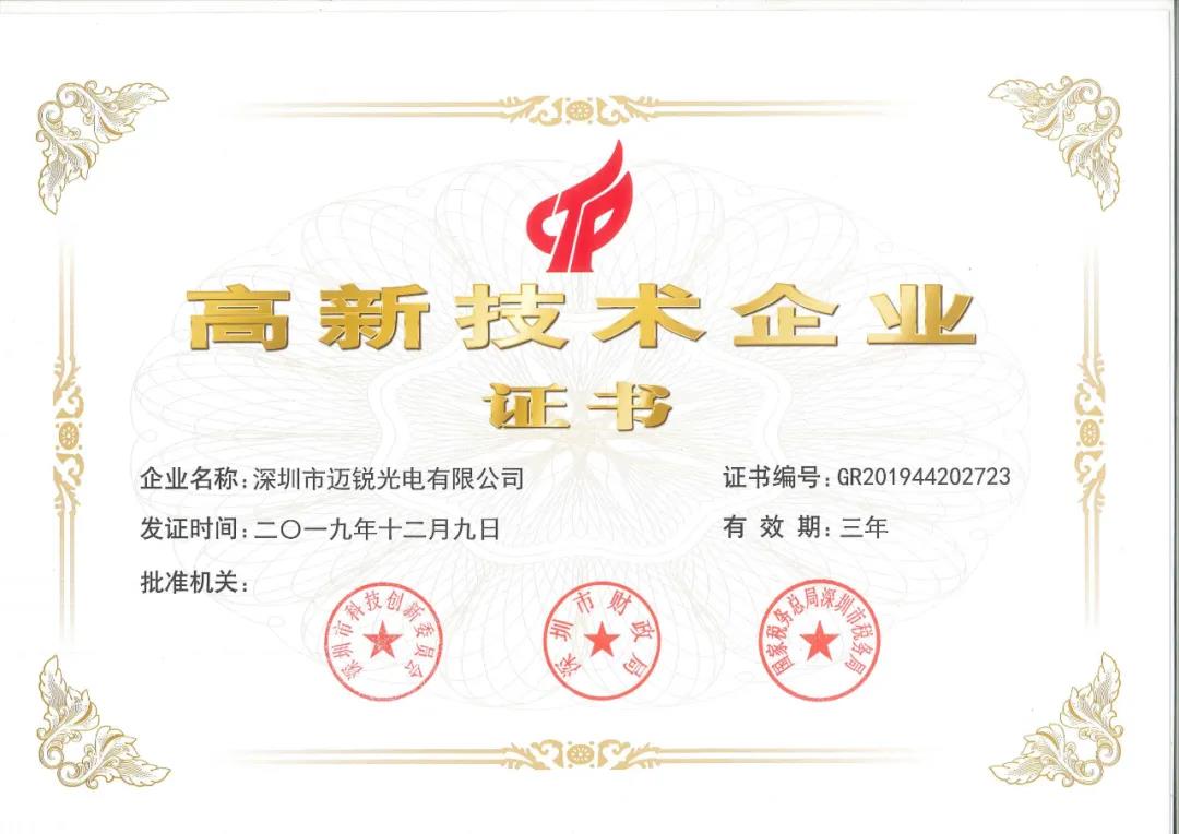 2020是新的開始,深圳市邁銳光電有限公司也踏上了新的征程,喜獲佳音——根據(jù)國(guó)家《高新技術(shù)企業(yè)認(rèn)定管理辦法》和《高新技術(shù)企業(yè)認(rèn)定管理工作指引》的相關(guān)規(guī)定,憑借專業(yè)的研發(fā)隊(duì)伍、雄厚的技術(shù)實(shí)力、持續(xù)的創(chuàng)新能力、科學(xué)的企業(yè)管理,邁銳繼續(xù)被認(rèn)定為國(guó)家級(jí)高新技術(shù)企業(yè)。