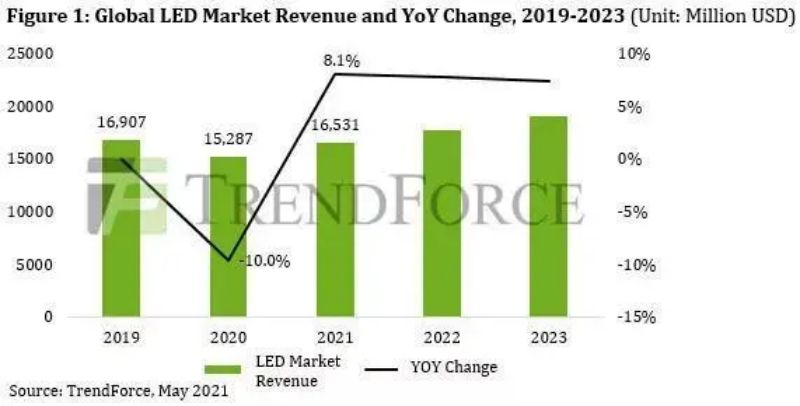 據(jù)集邦咨詢(TrendForce)全球 LED 市場調(diào)查報告數(shù)據(jù)顯示:預(yù)計 2021 年全球 LED 市場收入將達(dá)到 163.5 億美元,相比去年增長 8.1%,其中有一項增長就來自于戶外LED顯示屏。由此可見,戶外LED顯示屏的市場需求依然可觀。