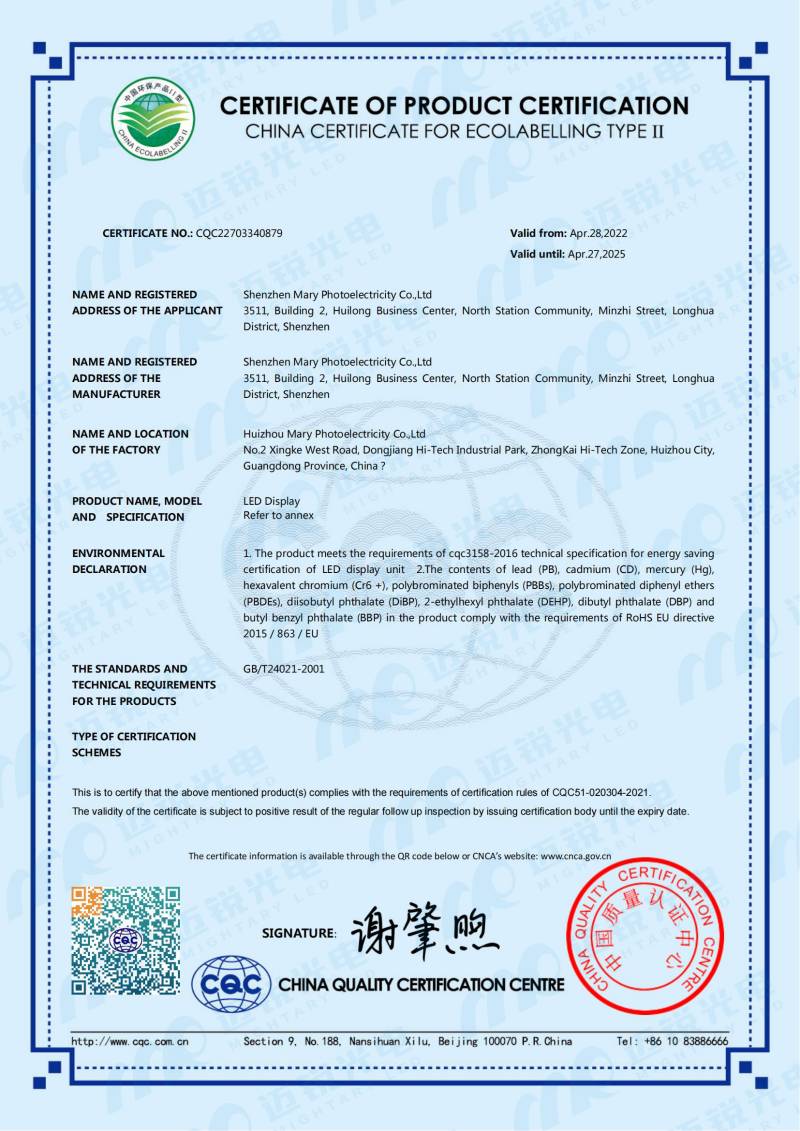 邁銳光電中英文CQC中國環(huán)保(Ⅱ)認證證書