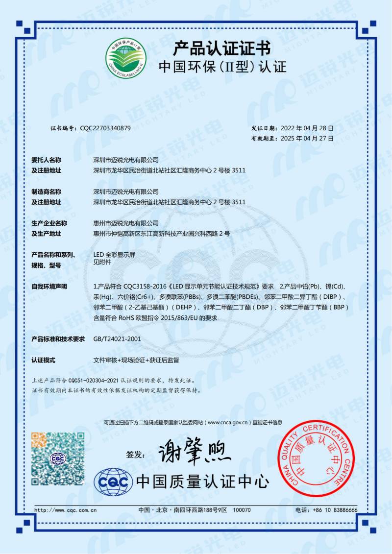 由國際知名、國內(nèi)權(quán)威的認證機構(gòu)——“中國質(zhì)量認證中心”權(quán)威認證,2022年4月28日,邁銳光電榮獲CQC中國環(huán)保(Ⅱ)認證證書。