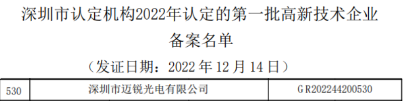 近日,全國高新技術(shù)企業(yè)認(rèn)定管理工作領(lǐng)導(dǎo)小組辦公室對深圳市2022年第一批認(rèn)定報備高新技術(shù)企業(yè)名單進(jìn)行了公示。經(jīng)過層層篩選和嚴(yán)格審核,深圳市邁銳光電有限公司正式被認(rèn)定為“高新技術(shù)企業(yè)”。