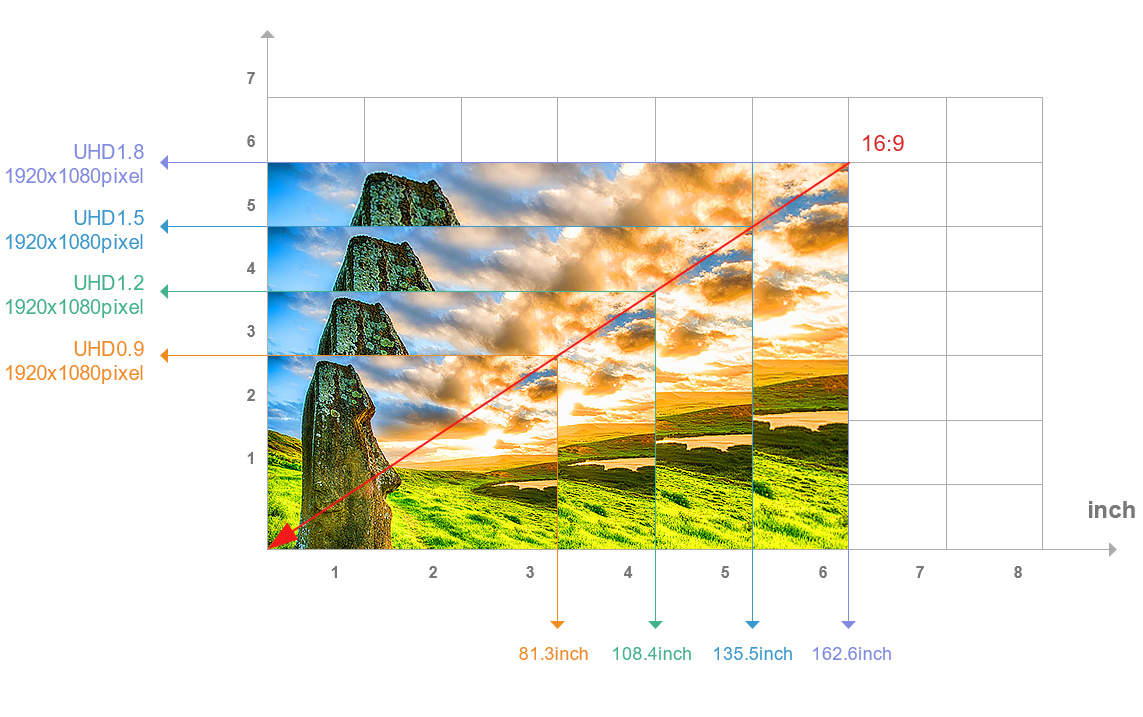 UHD箱體采用16:9比例設計,方便拼接16:9大屏,輕松實現(xiàn)FHD/4K/8K顯示畫面的拼接,匹配主流的16:9視頻,最大化真實還原播放內容,避免由于畫面放大或者縮小引起的變形模糊問題